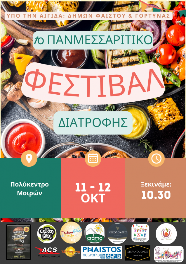 Το ερχόμενο Σαββατοκύριακο 11 και 12 Οκτωβρίου οι Δήμοι Φαιστού και Γόρτυνας συνδιοργανώνουν ένα φεστιβάλ αφιερωμένο στην υγιεινή διατροφή των παιδιών αλλά και των ενηλίκων της Μεσαράς στο Πολύκεντρο Μοιρών. Το πλούσιο πρόγραμμα περιέχει τόσο ομιλίες πάνω στη διατροφή όσο και σε γενικά θέματα υγείας, άσκησης, παιδαγωγικής παρακολούθησης και άλλων ενδιαφερόντων θεμάτων.