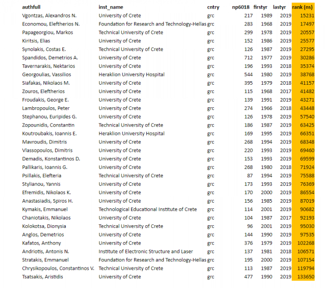 Στην Κρήτη δραστηριοποιούνται 32 επιστήμονες του καταλόγου, ενώ σε Ελληνικά ιδρύματα εμφανίζονται 301 διακεκριμένοι επιστήμονες που αναφέρονται στην δημοσίευση.
