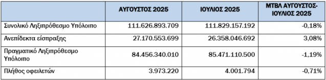 Σε σχέση με την αντίστοιχη περίοδο του 2024, ο αριθμός των οφειλετών παρουσιάζει μείωση κατά 1,02% (3.973.220 πλήθος οφειλετών τον Αύγουστο του 2025 έναντι 4.014.207 το 2024).