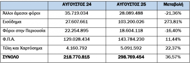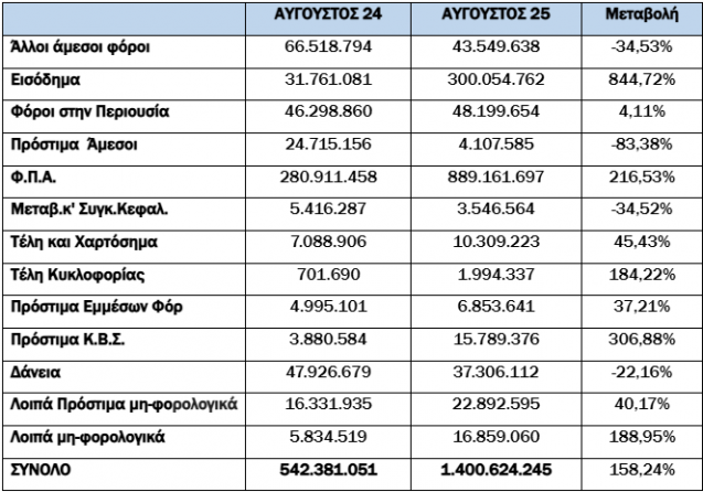 Για το μήνα αναφοράς (Αύγουστος) οι συνολικές εισπράξεις έναντι νέου ληξιπρόθεσμου (εκτός 10 ΜΦΚ) έφτασαν τα 318 εκατ. €, ενώ την ίδια περίοδο του 2024 είχαν φτάσει τα 239 εκατ. € (αύξηση κατά 33,05%).
