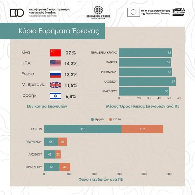 Συνολικά, τα στοιχεία δείχνουν μια άνισα κατανεμημένη και ποικιλόμορφη κοινότητα επενδυτών στην Κρήτη. Γενικότερα, η Περιφέρεια Κρήτης προσελκύει κυρίως άνδρες επενδυτές με μέσο όρο ηλικίας 53 ετών, αν και παρατηρούνται διαφοροποιήσεις ανά δήμο και περιφερειακή ενότητα. Η Δυτική Κρήτη συγκεντρώνει τη μεγαλύτερη μερίδα επενδυτών, με τους δήμους Αποκορώνου και Πλατανιά να συγκεντρώνουν περίπου το ήμισυ των επενδυτών της περιφέρειας. Οι επενδυτές προέρχονται από 48 χώρες, με κυρίαρχες την Κίνα, τις ΗΠΑ, τη Ρωσία και το Ηνωμένο Βασίλειο, ενώ κάθε περιφερειακή ενότητα παρουσιάζει διαφορετικό προφίλ καταγωγής. Νεότεροι επενδυτές εντοπίζονται κυρίως στους δήμους Ηρακλείου, Αγίου Βασιλείου, Πλατανιά και Αρχανών – Αστερουσίων, ενώ μεγαλύτερες ηλικίες καταγράφονται στη Σητεία και τον Μυλοπόταμο, αποτυπώνοντας ένα διαφοροποιημένο δημογραφικό προφίλ ανά περιοχή.