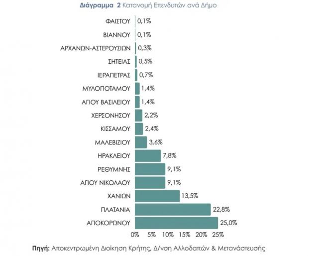 Οι περισσότεροι επενδυτές, σε ποσοστό 65%, «ψηφίζουν» Χανιά και προτιμούν, κυρίως, τους Δήμους Αποκορώνου και Πλατανιά.