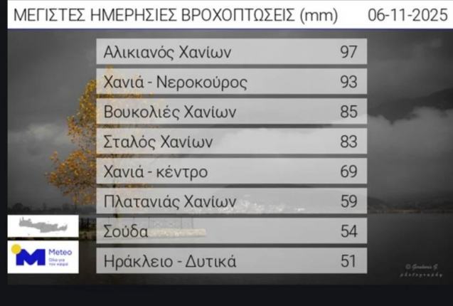 Στον πίνακα δίνονται τα 8 μεγαλύτερα ύψη βροχής μέχρι τις 7 το απόγευμα της Πέμπτης, όπως κατεγράφησαν από δίκτυο των 65 σταθμών που λειτουργεί το meteo.gr/Εθνικό Αστεροσκοπείο Αθηνών στο νησί, ενώ στον χάρτη που ακολουθεί δίνεται η γεωγραφική κατανομή των βροχοπτώσεων από το δίκτυο μας.
