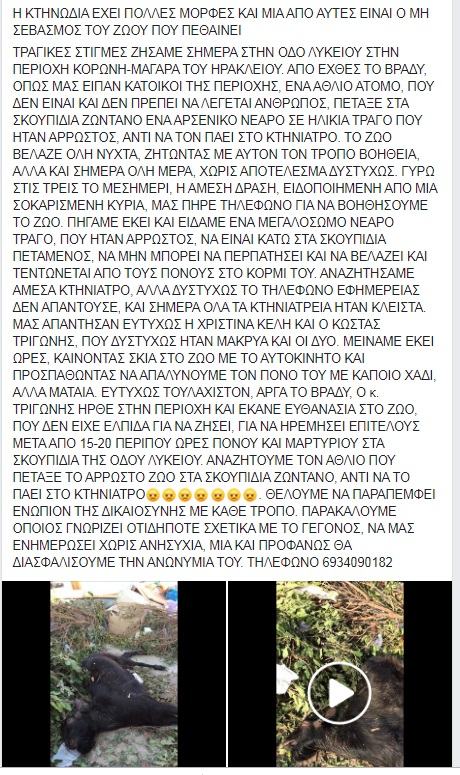 Μετά από πολύωρες προσπάθειες των ανθρώπων, έστω να ανακουφίσουν το ζώο το οποίο υπέφερε για πάνω από 15 ώρες στα σκουπίδια, κατέφθασε στο σημείο κτηνίατρος ο οποίος του έκανε ευθανασία τελειώνοντας το μαρτύριο του, καθώς όπως τόνισε, δεν είχε ελπίδα να ζήσει.