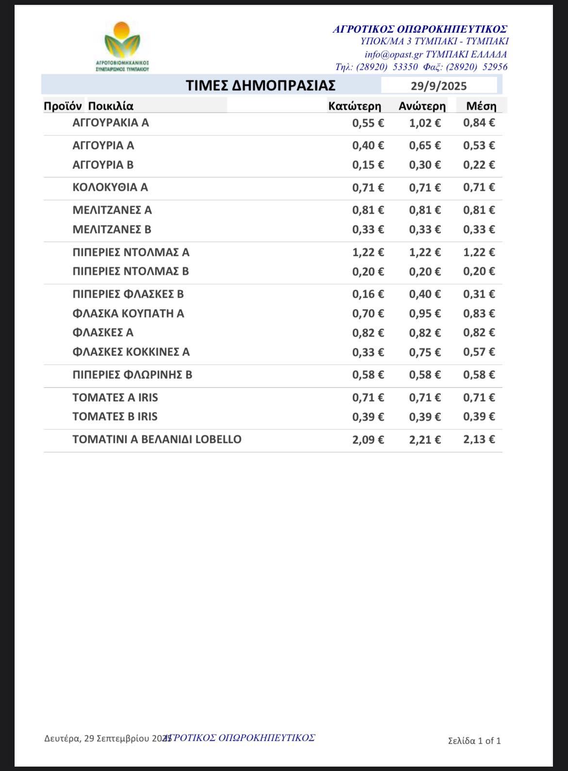 Τιμές από το Δημοπρατήριο του Α.Σ. Τυμπακίου.