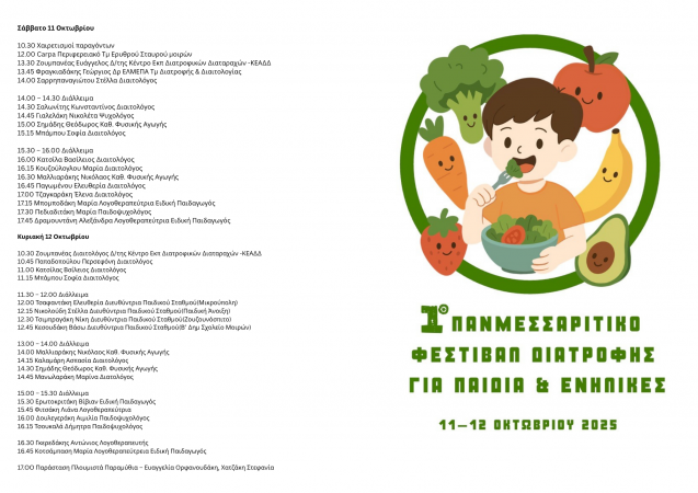 Το ερχόμενο Σαββατοκύριακο 11 και 12 Οκτωβρίου οι Δήμοι Φαιστού και Γόρτυνας συνδιοργανώνουν ένα φεστιβάλ αφιερωμένο στην υγιεινή διατροφή των παιδιών αλλά και των ενηλίκων της Μεσαράς στο Πολύκεντρο Μοιρών. Το πλούσιο πρόγραμμα περιέχει τόσο ομιλίες πάνω στη διατροφή όσο και σε γενικά θέματα υγείας, άσκησης, παιδαγωγικής παρακολούθησης και άλλων ενδιαφερόντων θεμάτων.