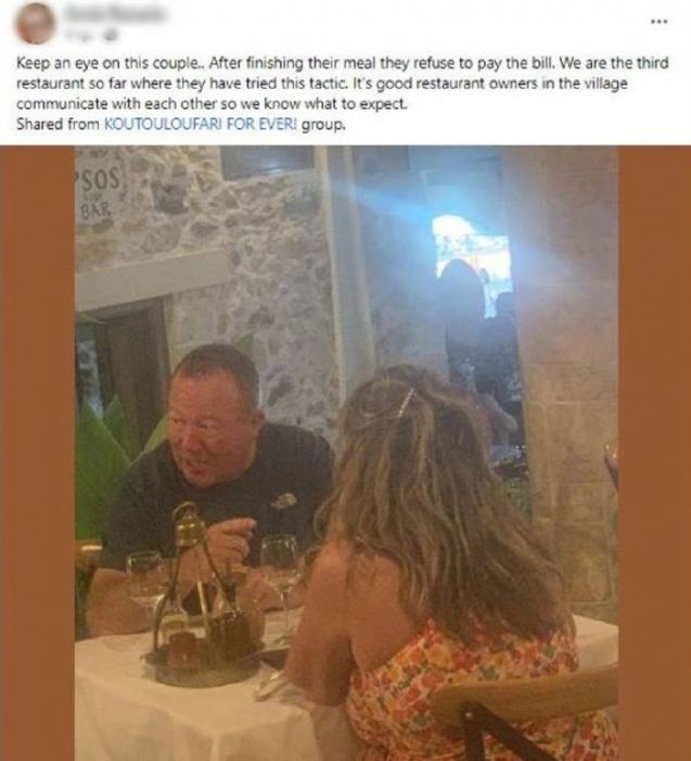 Την τελευταία φορά βρέθηκαν σε ένα γνωστό εστιατόριο του νησιού, το οποίο φημίζεται για τις εξαιρετικές πίτσες, τα θαλασσινά και τα παραδοσιακά ελληνικά φαγητά του. Ένας υπάλληλος, που εξοργίστηκε με τη συμπεριφορά τους, δημοσίευσε τη φωτογραφία των Βρετανών γράφοντας: «Έχετε τον νου σας σε αυτό το ζευγάρι. Αφότου τελειώνουν το φαγητό τους, αρνούνται να πληρώσουν τον λογαριασμό. Είμαστε το τρίτο εστιατόριο, στο οποίο εφαρμόζουν αυτή την τακτική. Είναι καλό να επικοινωνούμε μεταξύ μας για να ξέρουμε τι να περιμένουμε».