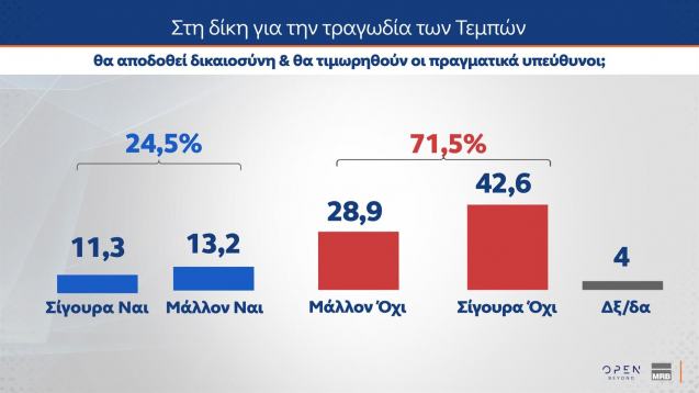 Μόλις το 24,5% δηλώνει πως εμπιστεύεται τη Δικαιοσύνη ότι θα τιμωρήσει τους πραγματικά υπεύθυνους για το έγκλημα των Τεμπών.