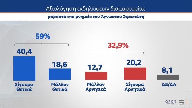Το 56,6% αξιολόγησε αρνητικά την απόφαση για ανάθεση της προστασίας του Μνημείου του Αγνώστου Στρατιώτη στο υπουργείο Άμυνας, με το 41,8% να απαντά αρνητικά με σιγουριά και το 14,8 να απαντά αρνητικά με αμφιβολίες.
