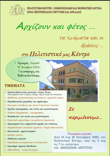 - I.M Γορτύνης&Αρακαδίας: Αρχίζουν οι δραστηριότητες του Πολιτιστικού Κέντρου-Σήμερα ο αγιασμός