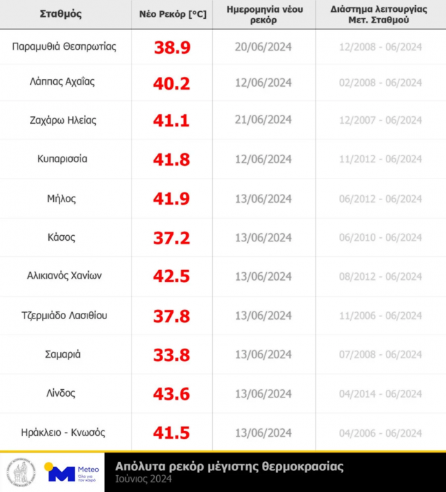 Εκτός, των πολλών και συνεχόμενων ημερών με θετικές αποκλίσεις, καταρρίφθηκαν και σημαντικά απόλυτα ρεκόρ μέγιστης θερμοκρασίας σε 11 σταθμούς του δικτύου αυτόματων μετεωρολογικών σταθμών του Εθνικού Αστεροσκοπείου Αθηνών / meteo.gr με αρχή λειτουργίας τους πριν το 2014. Στον παρακάτω πίνακα παρουσιάζονται τα 11 απόλυτα ρεκόρ μέγιστης θερμοκρασίας που καταγραφήκαν τον Ιούνιο 2024.