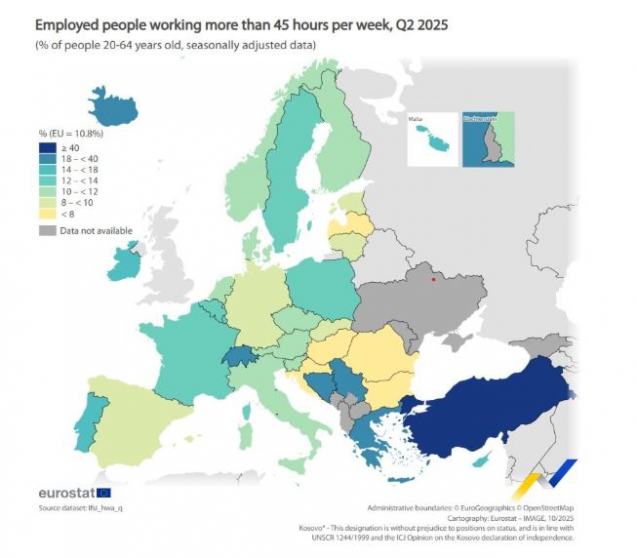 Νέα έρευνα της Eurostat αποκαλύπτει πως περισσότεροι από 1 στους 5 Έλληνες εργαζόμενους ηλικίας 20-64 ετών εργάστηκε περισσότερο από 45 ώρες σε εβδομαδιαία βάση κατά το β’ τρίμηνο του 2025 από 10,8% που ήταν στην ΕΕ.