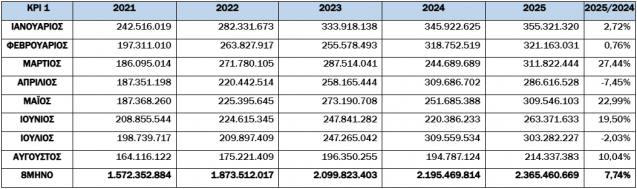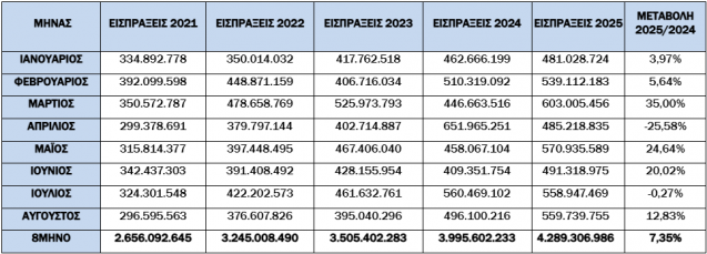 Για το 8μηνο, οι συνολικές εισπράξεις έναντι νέου ληξιπρόθεσμου (εκτός 10 ΜΦΚ) έφτασαν τα 1,861 εκατ. ευρώ, ενώ την αντίστοιχη περίοδο του 2024 έφτασαν τα 1,663 εκατ. ευρώ (αύξηση κατά 11,91.