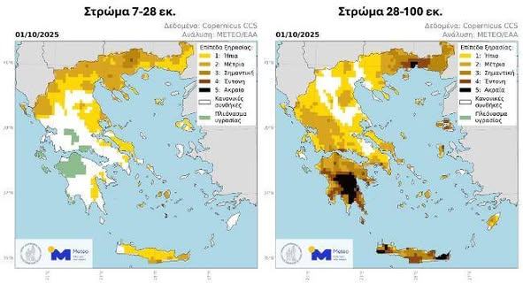Στο βαθύτερο στρώμα, περιοχές όπως η Κρήτη, η Πελοπόννησος και η ανατολική Μακεδονία αντιμετώπιζαν έντονη έως ακραία ξηρασία.