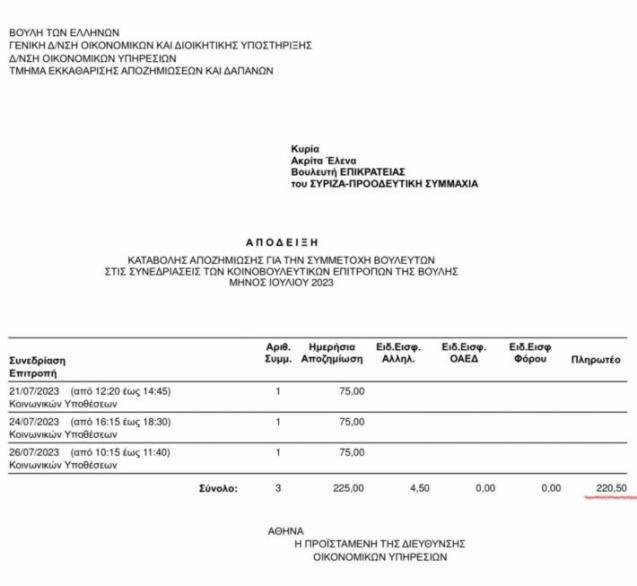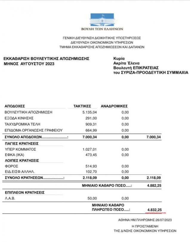 Η κ. Ακρίτα με ένα status στο Facebook το οποίο συνοδευτόταν κι από δυο φωτογραφίες έλυσε το μυστήριο αποκαλύπτοντας το ποσό που εισέπραξε η ίδια. Σημειώνεται ότι απ’ το τελικό καθαρό ποσό έχουν αφαιρεθεί 1027 ευρώ τα οποία είναι οι κρατήσεις υπέρ του κόμματος. Έγραψε συγκεκριμένα: