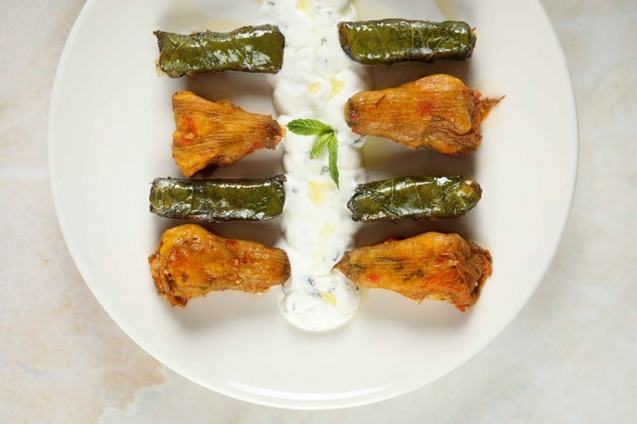 Ντολμαδάκια με φύλλα και ανθούς κολοκυθιού, με σος γιαουρτιού και φρέσκα μυρωδικά