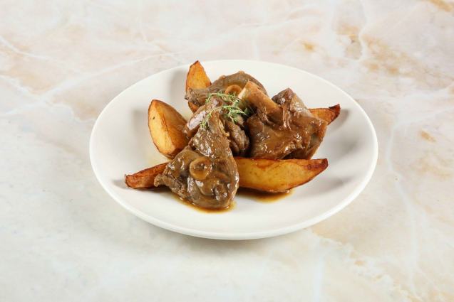 Σφακιανό κατσικάκι τσιγαριαστό σε ελαιόλαδο & θαλασσινό αλάτι, σβησμένο με κόκκινό κρασί, σερβίρεται με χωριάτικες πατάτες τηγανιτές