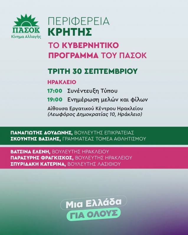 Το Κυβερνητικό του Πρόγραμμα θα παρουσιάσει το ΠΑΣΟΚ, την Τρίτη 30 Σεπτεμβρίου στις 19:00, στο Ηράκλειο.Η εκδήλωση θα πραγματοποιηθεί στην αίθουσα του Εργατικού Κέντρου Ηρακλείου (Λεωφόρος Δημοκρατίας 10).