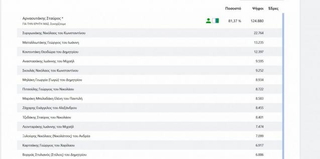Πρώτος με ποσοστό 78,25% ο Σταύρος Αρναουτάκης που παραμένει στο τιμόνι της Περιφέρειας.Αγγίζει το 100% η ενσωμάτωση