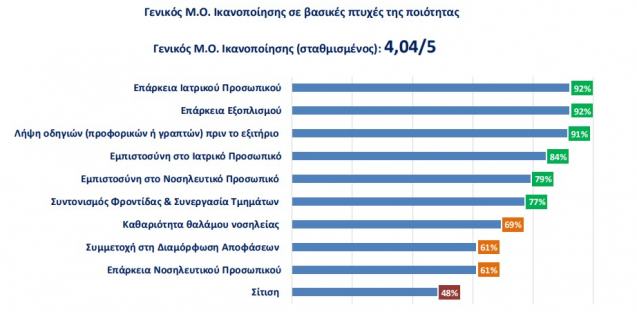 Αντίθετα, πιο μέτριες βαθμολογίες συγκεντρώνουν η καθαριότητα των θαλάμων (69%), η συμμετοχή στη διαμόρφωση αποφάσεων και η επάρκεια νοσηλευτικού προσωπικού (61%).