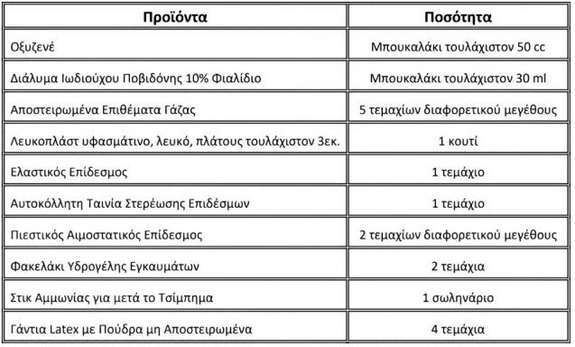Σύμφωνα με την οδηγία, το φαρμακείο θα πρέπει να περιλαμβάνει: